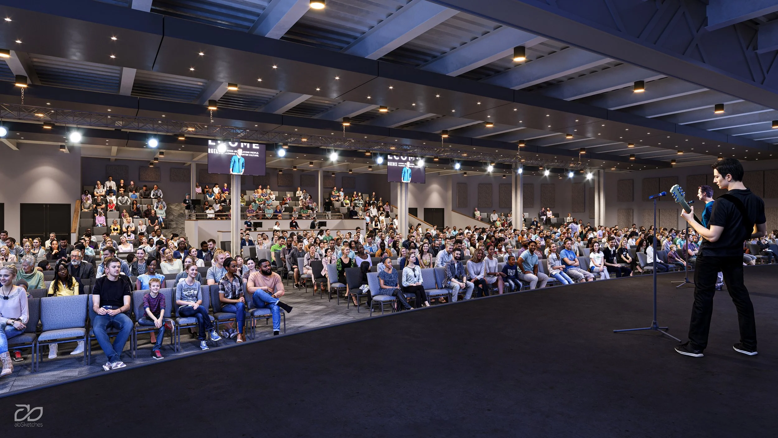 Take a sneak peek at our vision for interior renovations at Emergence Church in Totowa, New Jersey. To create more space for community and worship in their current space, we will be removing columns in the existing worship center and using adjoining space from prior tenants to create an expansive, welcoming lobby, cafe and children’s ministry.